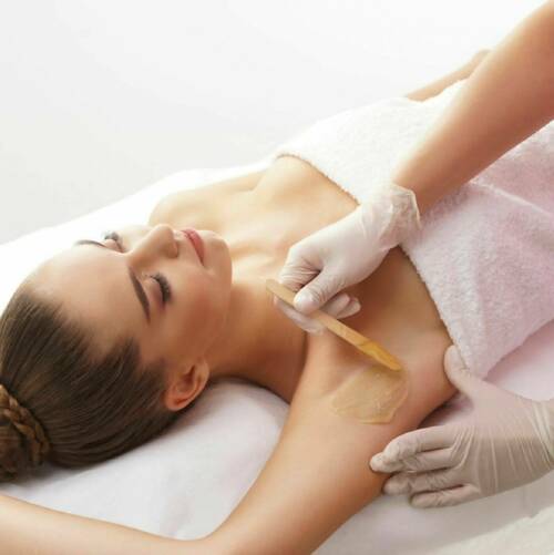 Using gentle hot wax, hair is removed from the under arm area. Hot wax is spread over the area, as it sets, it grips each hair for easier removal and smooth results