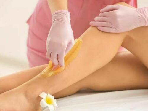 Using wax and strips, hair is removed from the knee as far as the ankle.