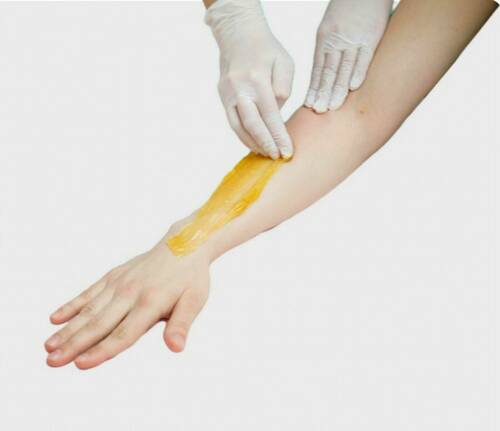 Using a combination wax and strips and hot wax, hair is removed from the upper and lower arm area including elbows and hands.